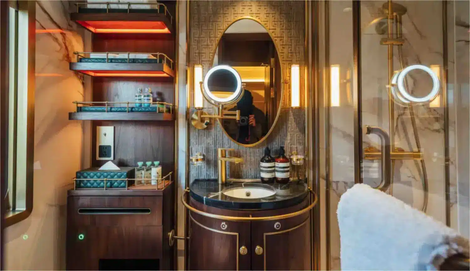 The Han Dynasty Suite redefines luxury rail travel with its expansive 22.2 m² design and refined elegance. Featuring a double bed, double sofa, and separate living area with a dining table, it offers the privacy of a personal retreat while journeying across the Silk Road. A 5.2 m² marble bathroom includes a bathtub, shower, and double sinks, blending comfort with sophistication. Premium touches—a Dyson hairdryer, smart toilet, minibar, and full-length wardrobe—enhance the experience. More than a cabin, the Han Dynasty Suite is a private sanctuary of indulgence, crafted for travellers who value space, style, and serenity.