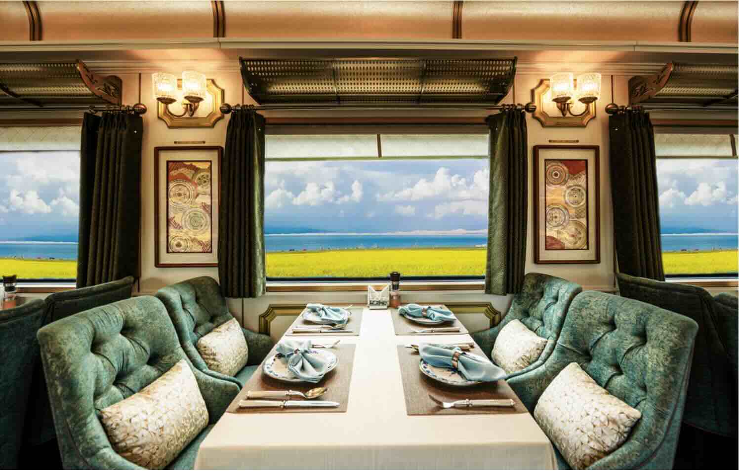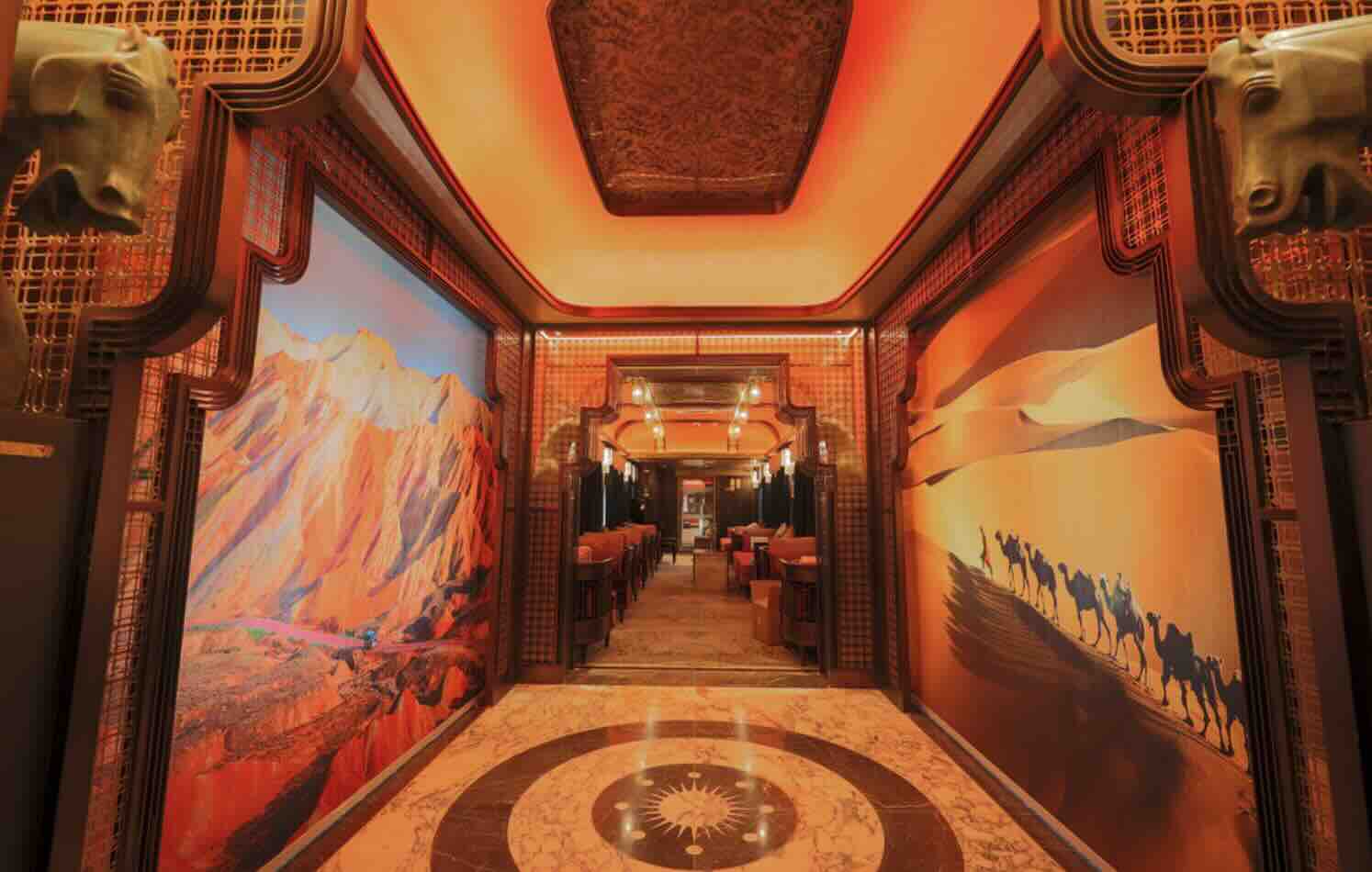 The restaurant cars offer an unforgettable dining experience blending international elegance with local authenticity. In the Western-style restaurant car, guests enjoy a refined yet welcoming setting, where silver-service tradition and attentive stewards create an atmosphere of five-star sophistication—perfect for social banquets or quiet meals alike. For a more intimate ambience, the Chinese-style restaurant car features elegant booth seating inspired by regional design. Here, travellers can savour authentic Chinese flavours crafted by expert chefs using fresh, locally sourced ingredients. Whether indulging in gourmet Western cuisine or exquisite Asian specialities, every meal celebrates the cultural richness of the Silk Road journey.