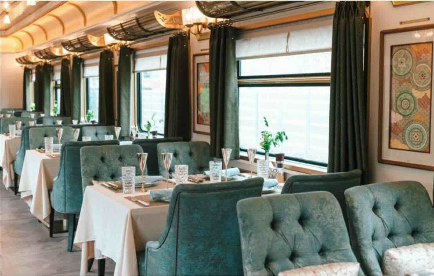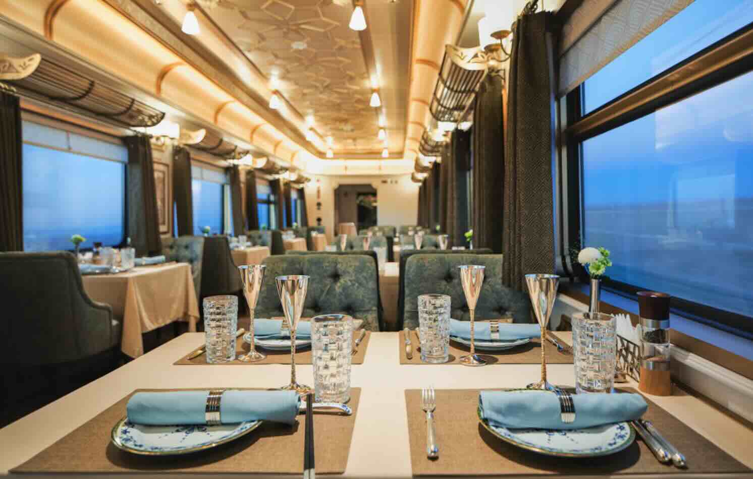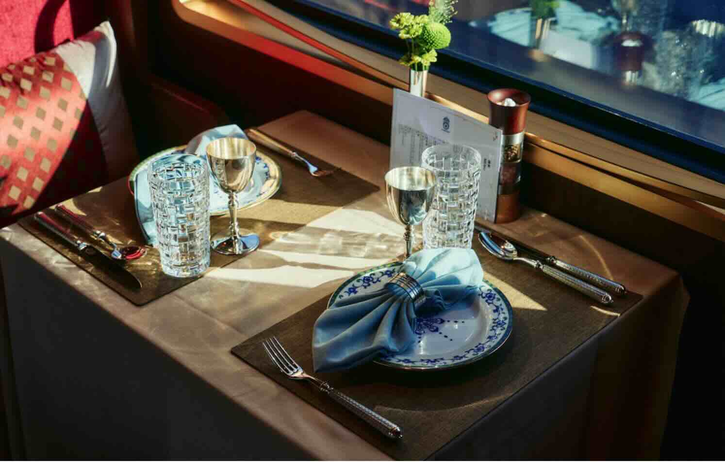 Cuisine is the purest expression of culture, and every dish tells a story of the lands we explore. Dining here is an art form—refined, authentic, and unforgettable. Our two restaurant cars, designed by Hirsch Bedner Associates (HBA), offer elegant surroundings where world-class flavours and service meet. Guests dine amid vintage British silverware, French Alain Saint-Joani cutlery, and exquisite Nachtmann glassware, each detail chosen to elevate the experience.
