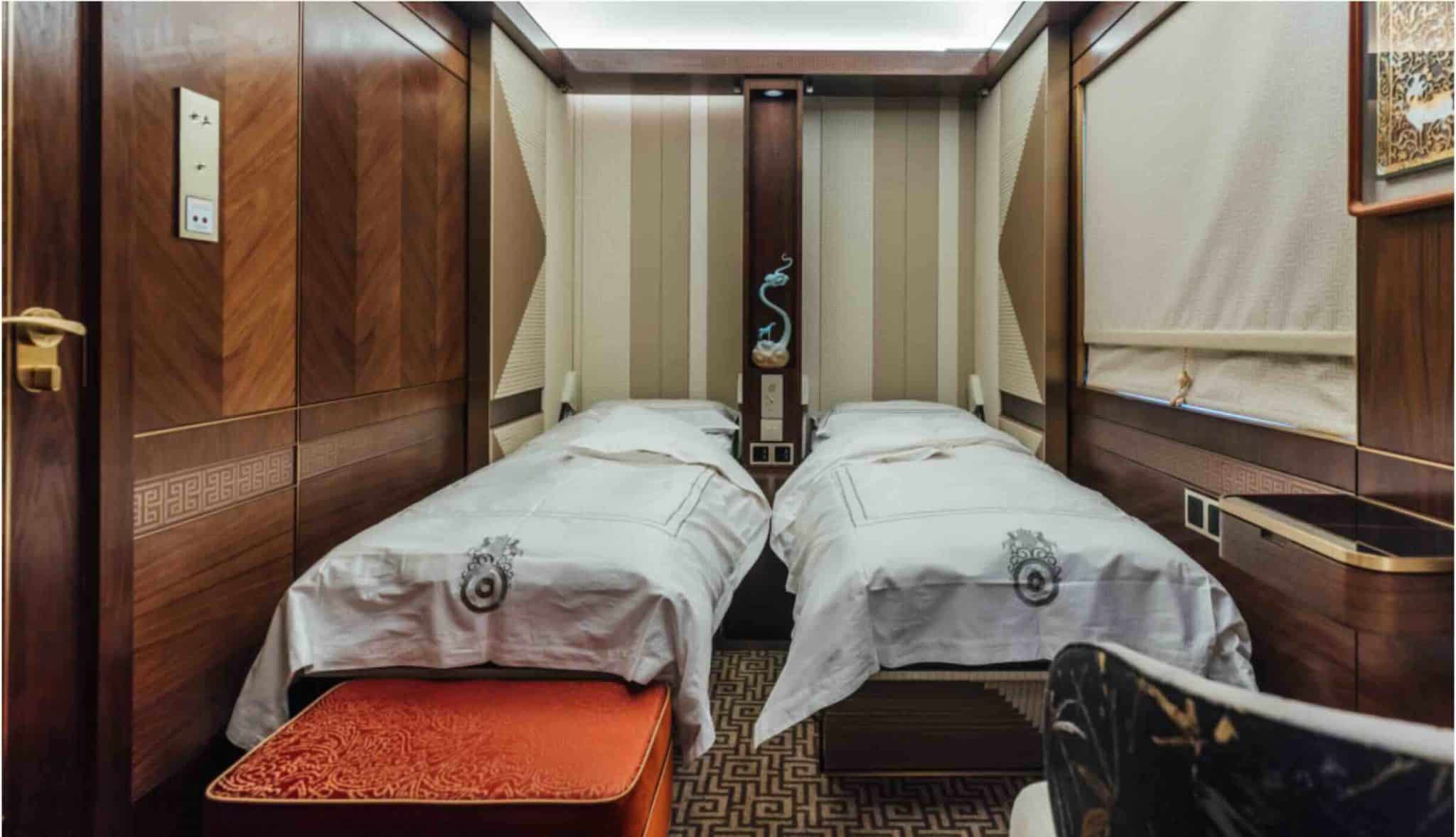 This train has some of the most luxurious cabins to be found on the rails. There are three categories of cabins, Superior twin and Superior deluxe and the Han Dynasty Suites. All cabins come with high standard, ensuite bathrooms. Note that the trips that operate outside of China as part of the itinerary use a different train with different cabins. The section in Vietnam uses the Sjourney Vietnam Luxury Express train and the section in Central Asia uses the Golden Eagle Luxury Train. See those trains for a description of their cabins.