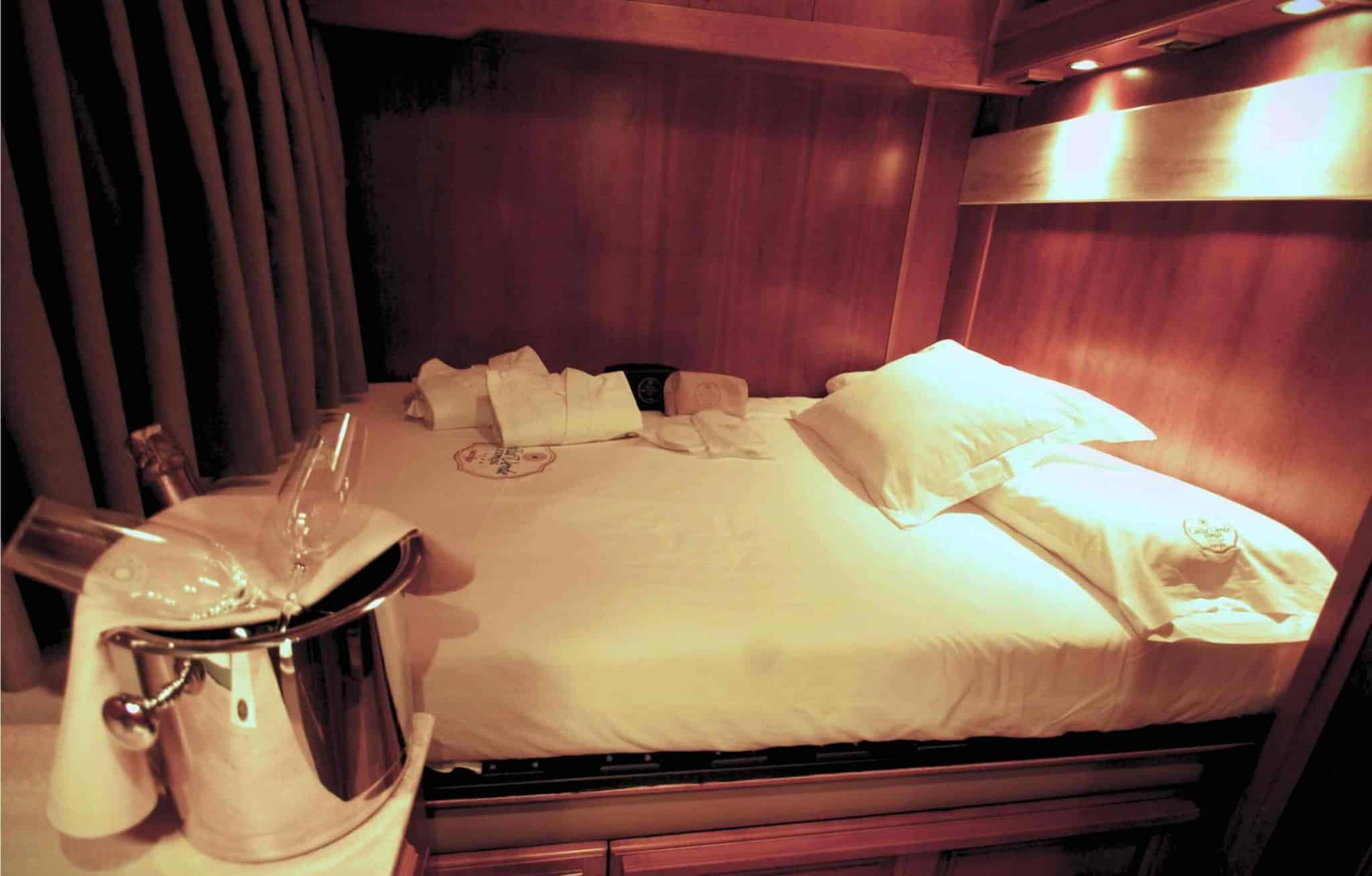The standard double bed in each cabin is 1.35 m × 1.80 m (≈ 4 ft 5 in × 5 ft 11 in) in “night” mode.