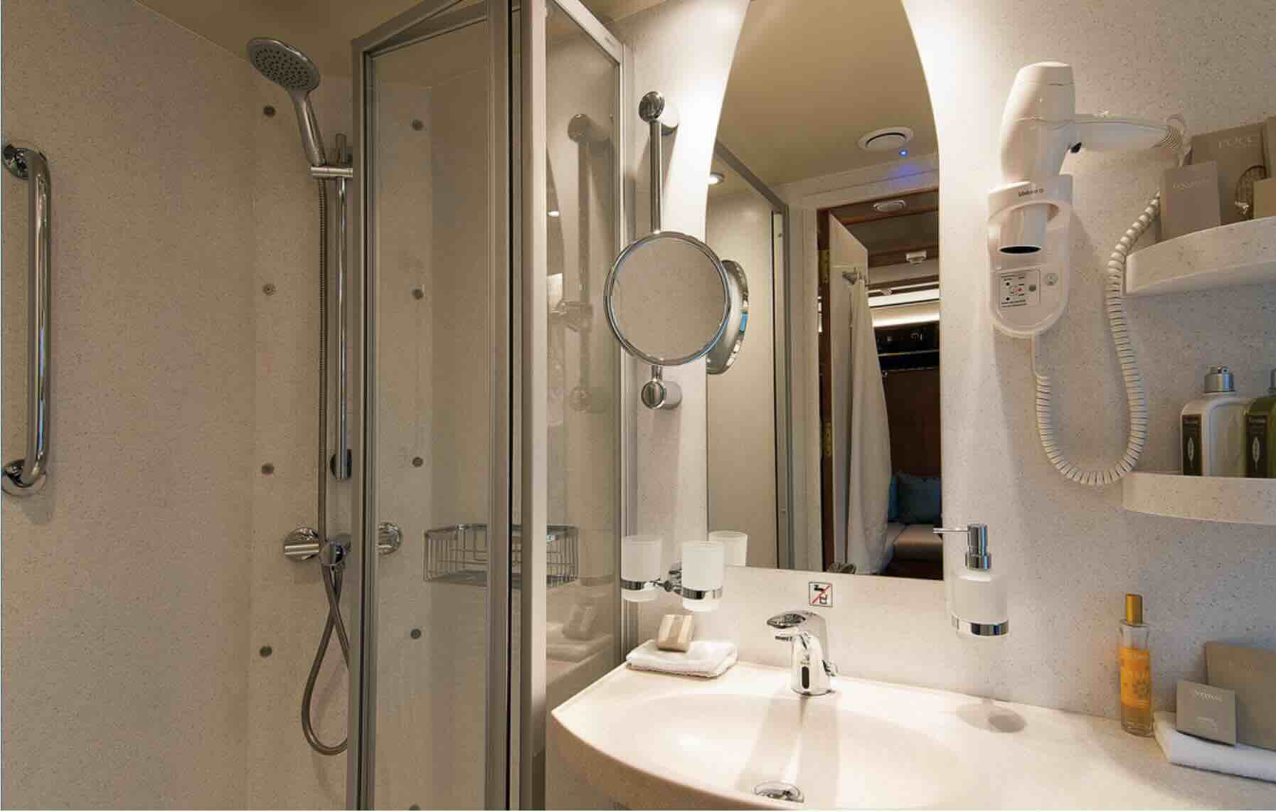 Private bathrooms have a shower, toilet, and washbasin with hot water. A heated towel rail, hairdryer, and shaver socket are available. There are a variety of toiletries on offer and a dressing gown. Cabins can be individually controlled by air-conditioning, lighting, and power sockets. Coordinated fabrics go well with wood-panelled walls, brass fittings and co-ordinated fabrics.