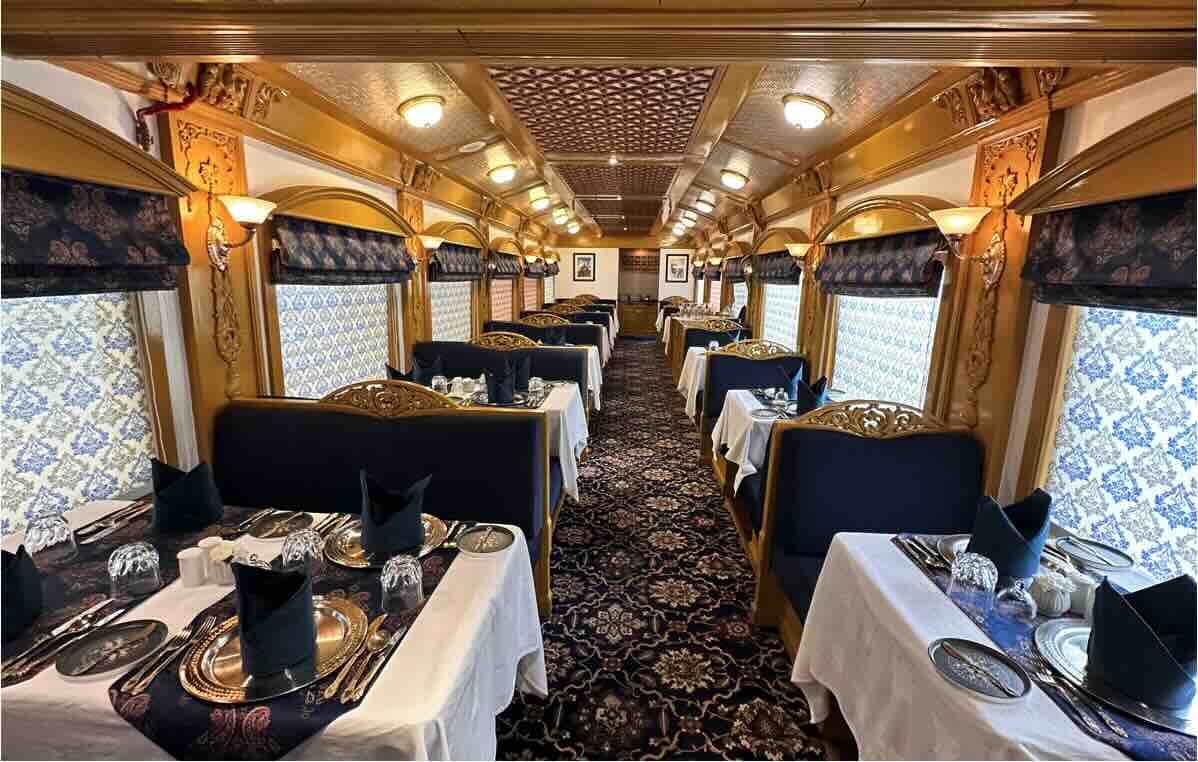 Life onboard the Deccan Odyssey blends the romance of classic Indian rail travel with contemporary comfort. Designed to evoke the elegance of India’s royal heritage, the train features richly detailed interiors inspired by regional palaces, with polished wood, silk fabrics and traditional motifs throughout.